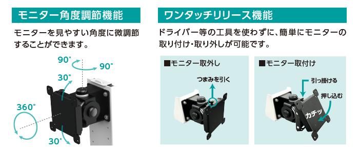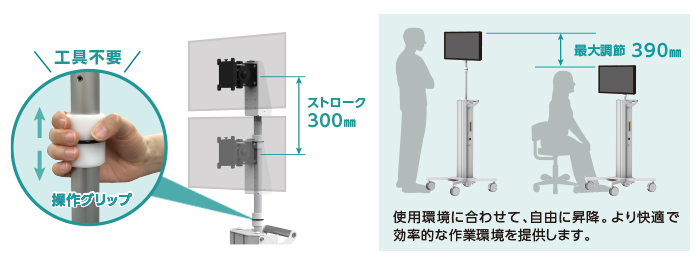 グリップを上下に動かすだけで、簡単に昇降が可能。見やすい高さにモニターを調節できます。