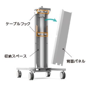 ケーブル用のフックと収納スペースを備えており、配線をすっきり