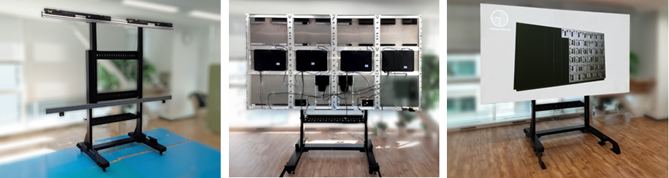 当初はLEDビジョンを壁面に取り付ける計画でしたが、会議室でLEDビジョンを設置できる壁(面)が無いことが判明し、